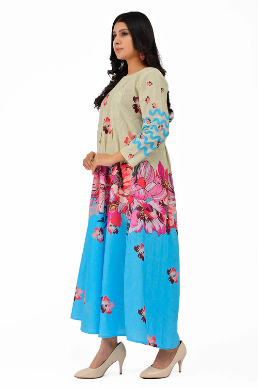 Sunset Orange & Mint Green Floral Cotton Maxi Dress